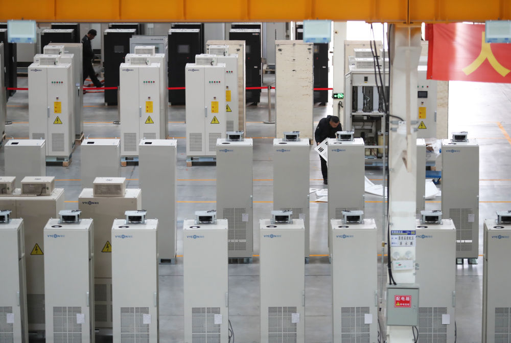 在生產研發飛輪儲能技術的沈陽微控新能源技術有限公司,工人在車間工作(2023年11月29日攝)。新華社記者 楊青 攝
