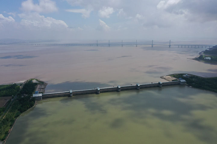 曹娥江大閘是我國強涌潮河口地區第一大閘,浙東水資源配置重要樞紐工程(2023年8月4日攝,無人機照片)。新華社記者 黃宗治 攝