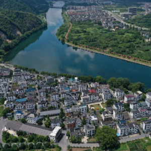在浙江省衢州市開化縣拍攝的錢塘江源頭河——馬金溪沿岸金星村拍攝的村莊一景(2023年8月2日攝)。新華社記者 黃宗治 攝
