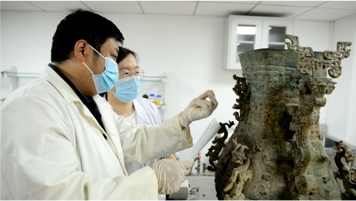 2019年,時值河南博物院開展抗震加固工程,所有展品都搬進了庫房,蓮鶴方壺也迎來了一次更加全面的修復:編制修復方案、用新材料對底座進行支撐和加固、用X光片探傷并采集內部構造信息、進行三維數據掃描和數字化保護……