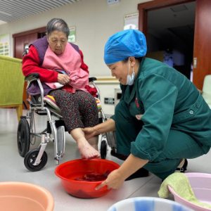 2023年10月17日,在青海省西寧市城西區通海路街道綜合養老服務中心,養老護理員為入住的老人洗腳。新華社記者張子琪 攝