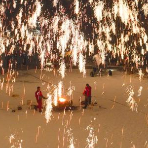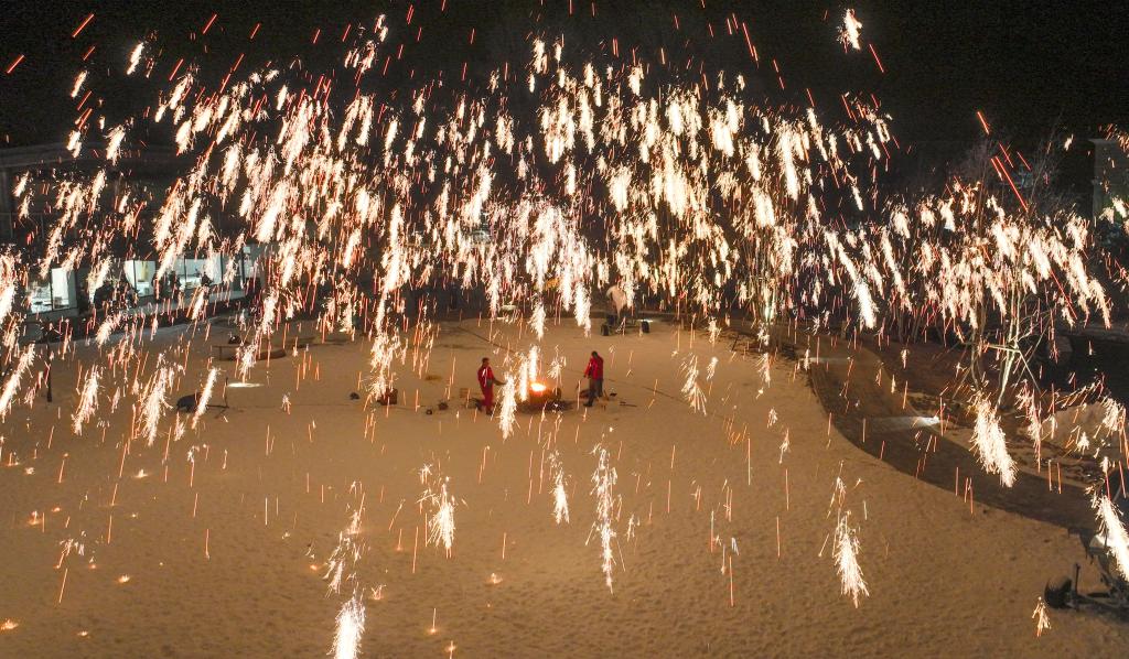 1月13日,民間藝人在河北省承德市興隆縣一景區為游客表演“打樹花”(無人機照片)。新華社發(劉滿倉 攝)