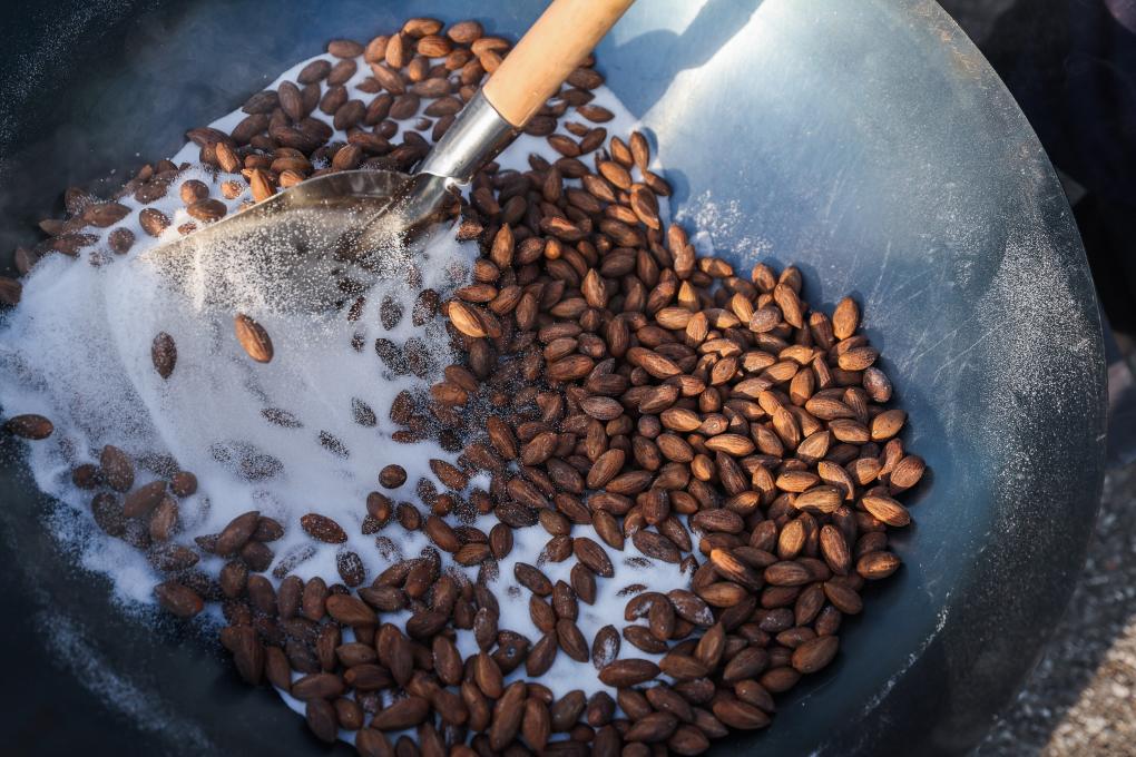 ↑ 2023年10月22日,香榧種植戶們正在用鹽炒制香榧。