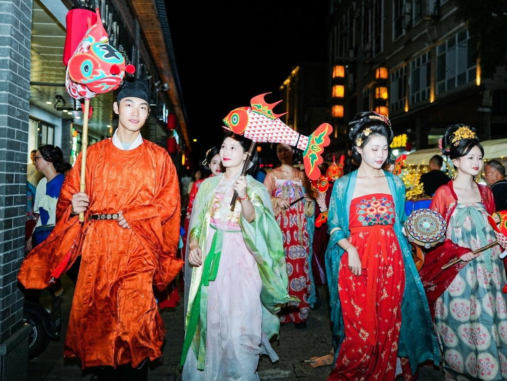 ↑ 2023年8月18日,在杭州市臨安區昌化鎮,游客身著傳統服飾打卡“唐昌之夜”主題文化節。