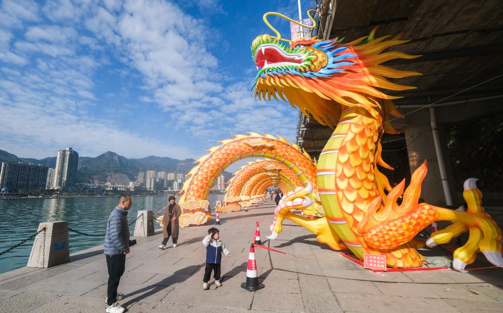 ↑ 2024年1月14日拍攝的青田縣甌江畔的神龍彩燈。隨著農歷新年的臨近,浙江省麗水市青田縣的鄉鎮及城區開始做龍燈、辦燈展,形態各異的傳統龍燈為迎接龍年新春佳節營造出濃濃的喜慶氛圍。