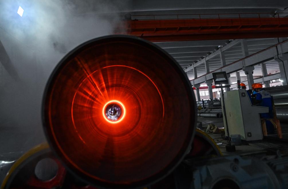 ↑ 2023年3月23日,在位于嘉興市的國家專精特新“小巨人”企業——浙江德威不銹鋼管業股份有限公司鋼管熱處理車間,熱處理工在進行鋼管焊后固溶處理。