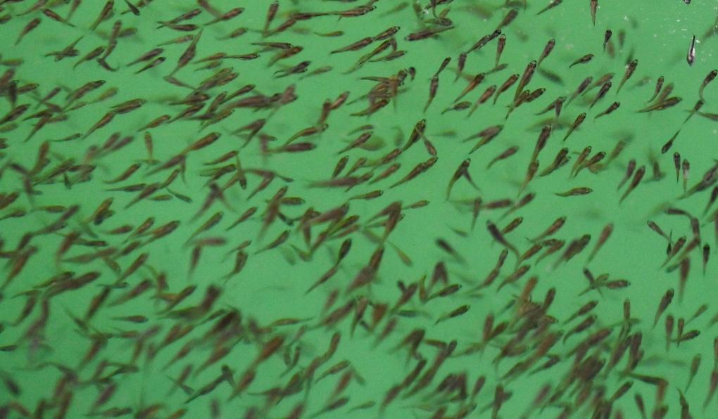 ↑ 2023年3月2日在湖州市吳興區東林鎮保健村的湖旺水產基地拍攝的鱸魚魚苗。春季是水產養殖戶育苗的關鍵期,隨著氣溫的升高,浙江省湖州市吳興區東林鎮的水產養殖戶們開始大規模地將鱸魚、鯽魚、鰱魚等種類的魚卵孵化成魚苗并進行培育,為新一年的水產養殖季做好準備。