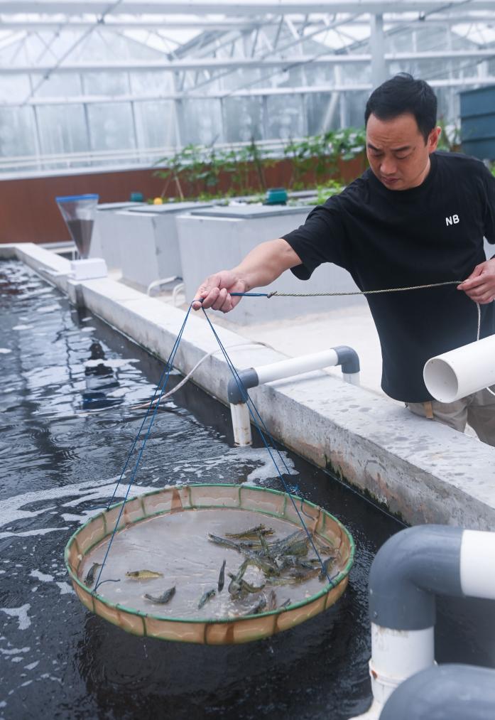 ↑ 2023年9月13日,回鄉創業的農創客徐建剛在“魚菜共生”共富工坊的海水養殖池內,查看南美白對蝦的長勢情況。