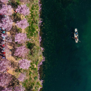 ↑ 2023年3月14日,在浙江省金華市浦江縣浦陽江同樂段,工作人員乘船在打撈水面漂浮物,游客在岸邊的櫻花大道觀賞櫻花。