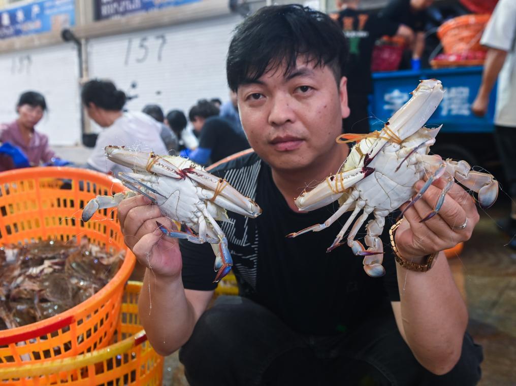 ↑ 2023年8月7日,在舟山普陀沈家門舟山國際水產城碼頭,商戶在展示剛剛捕撈上岸的梭子蟹。