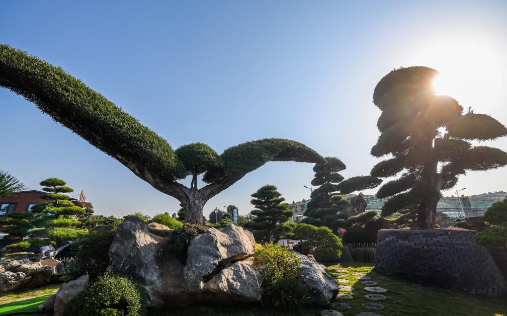 ↑ 2023年11月25日,金華市金東區澧浦花木城的第二十一屆中國(金華)花卉苗木博覽會上展示的庭院景觀樹羅漢松“大鵬展翅”。