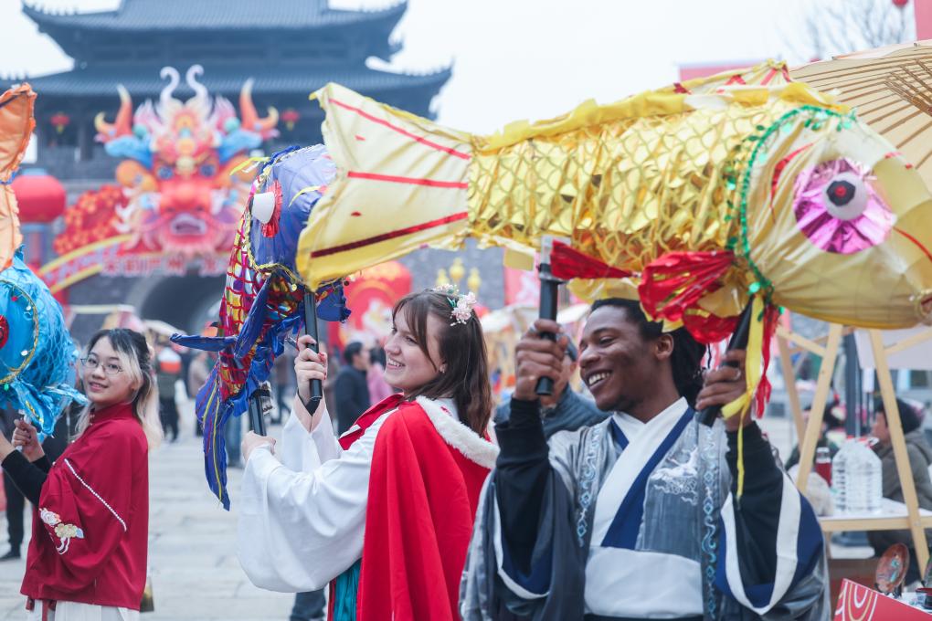 ↑ 2024年1月18日,中外青年身著傳統服飾在建德嚴州古城宋韻集市上體驗傳統魚燈。當日,近百名國內外青年齊聚浙江省建德市嚴州古城,參加“‘宋’福杭州年——我在建德過大年”活動,在建德嚴州古城體驗包括宋韻集市、傳統婚禮習俗、特色民俗踩街表演等特色活動,讓國內外青年朋友們沉浸式體驗了一場大型非遺民俗過大年的熱鬧場景。