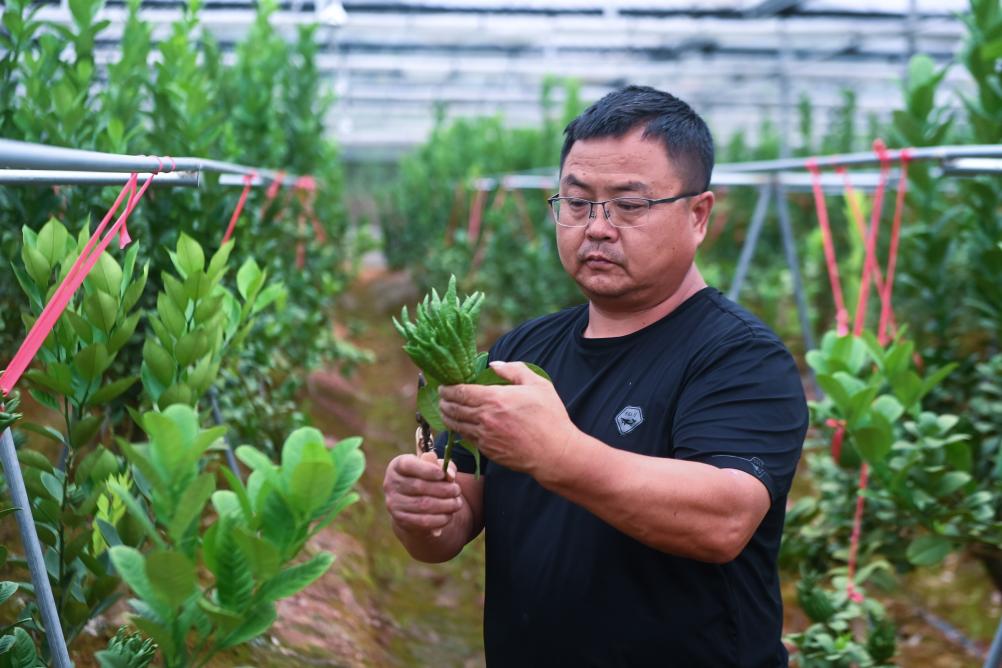 ↑ 2023年6月20日,在金華市金東區赤松鎮北山口村的佛手生態種植園內,種植戶葉小林在查看佛手青果的生長情況。