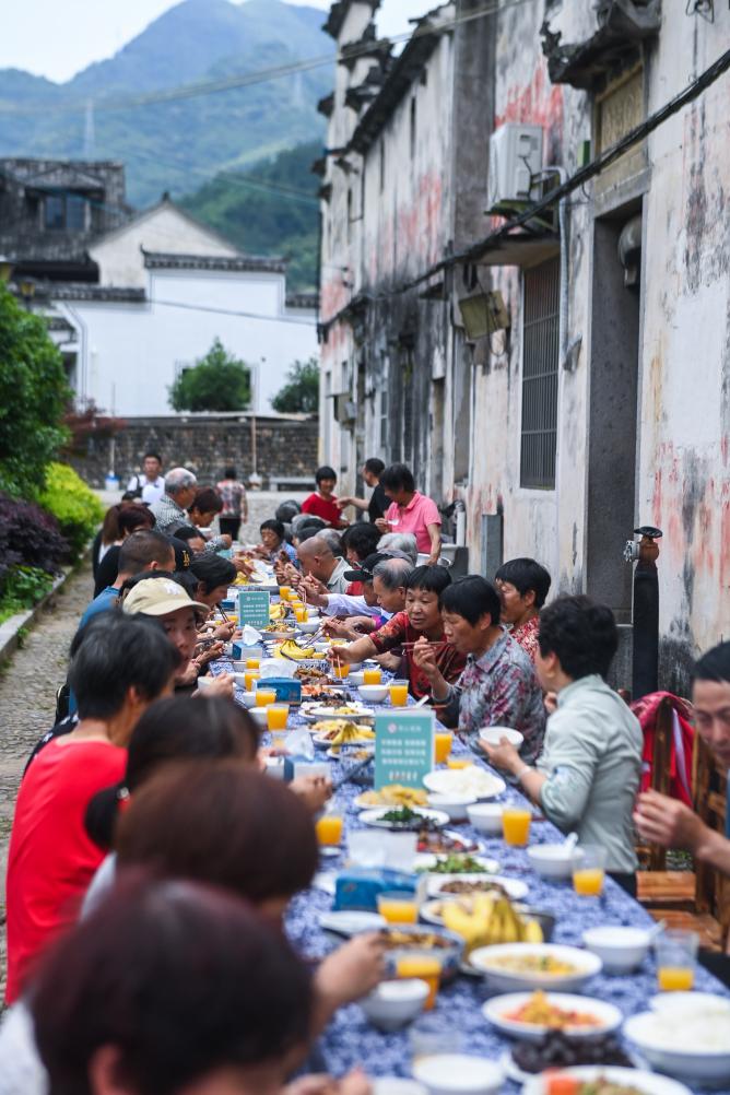 ↑ 2023年5月26日,老人們在斯宅村門前畈古民居的敬老宴現場品嘗特色美食。