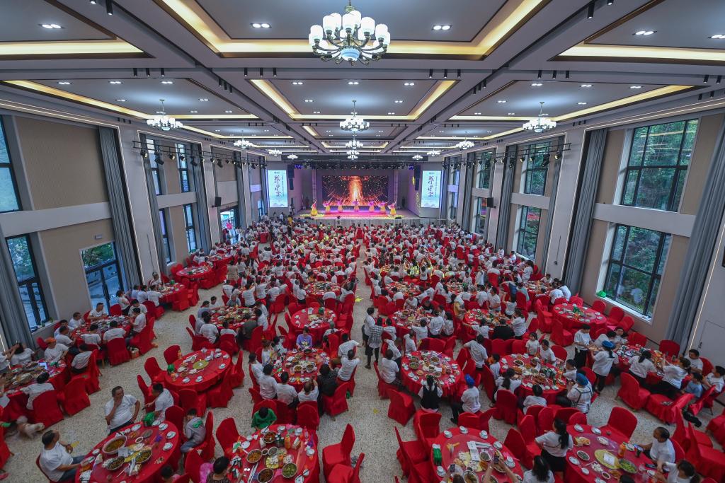 ↑ 2023年5月27日,梅坪村的村民在新建成的文化中心內的村文化禮堂,參加百家宴并觀看文藝演出。