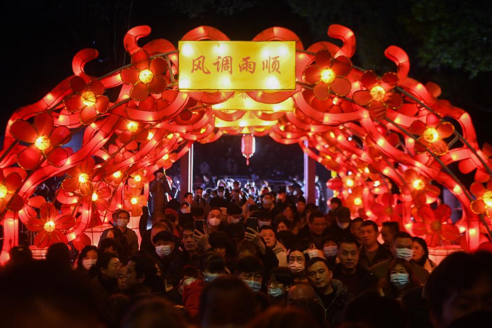 ↑ 2023年1月29日,在嘉興市秀洲區新塍古鎮小蓬萊公園內,人們前來觀賞“鰲山燈會”的彩燈。