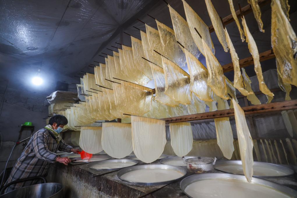 ↑ 2024年1月16日,在諸暨市安華鎮勾乘山村,村民宣保鳳在制作傳統豆腐皮。春節臨近,浙江省諸暨市安華鎮的傳統年貨——豆腐皮迎來銷售旺季。村民加緊制作豆腐皮,供應節日市場。安華鎮勾乘山村是安華豆腐皮的發源地和主要產區,村民憑著自己的勤勞和智慧,把安華豆腐皮做成了當地的一張 “金名片”。