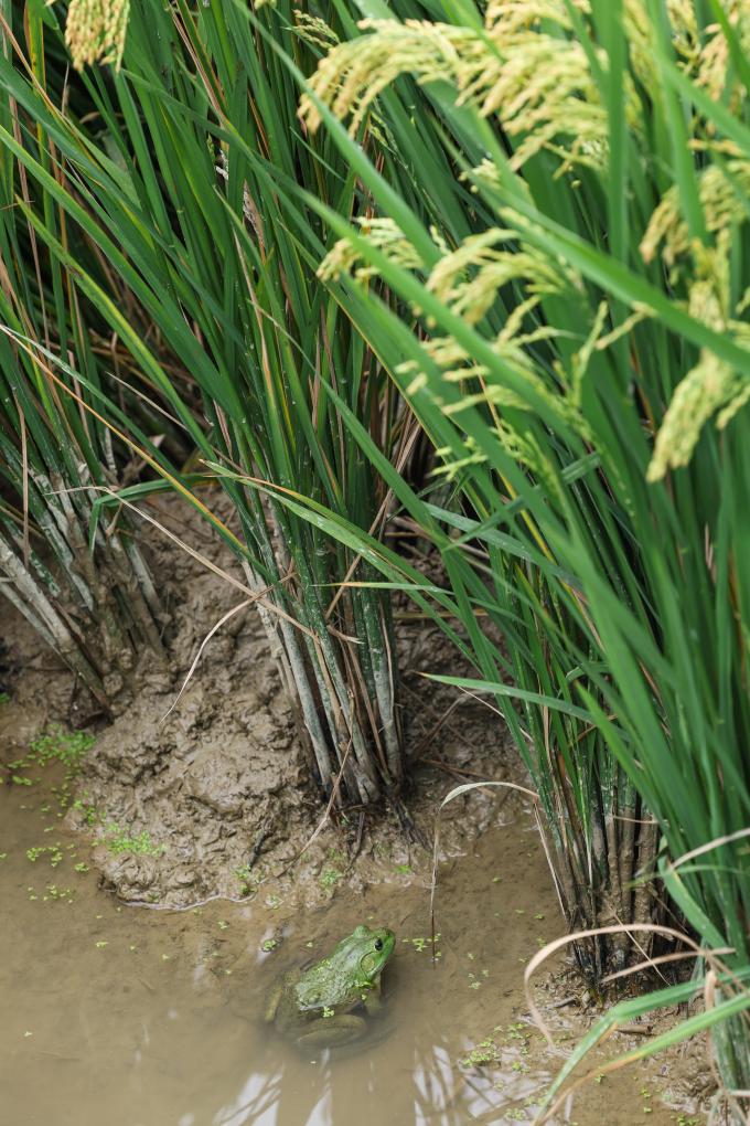 ↑ 2023年10月13日在杭州臨安太陽鎮的杭州佳稷農業生態稻米種植基地拍攝的稻田里套養的牛蛙,套養能讓每畝增收2000至3000元。