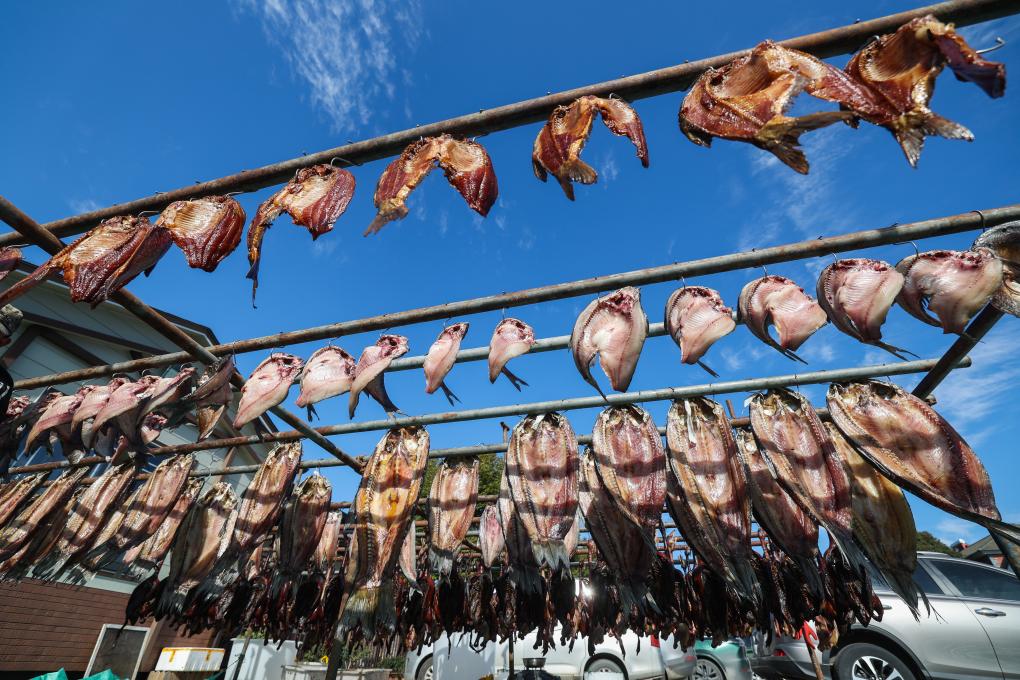 ↑ 2023年12月14日,諸暨市店口鎮白塔湖畔的何家山頭村村民在晾曬魚干。