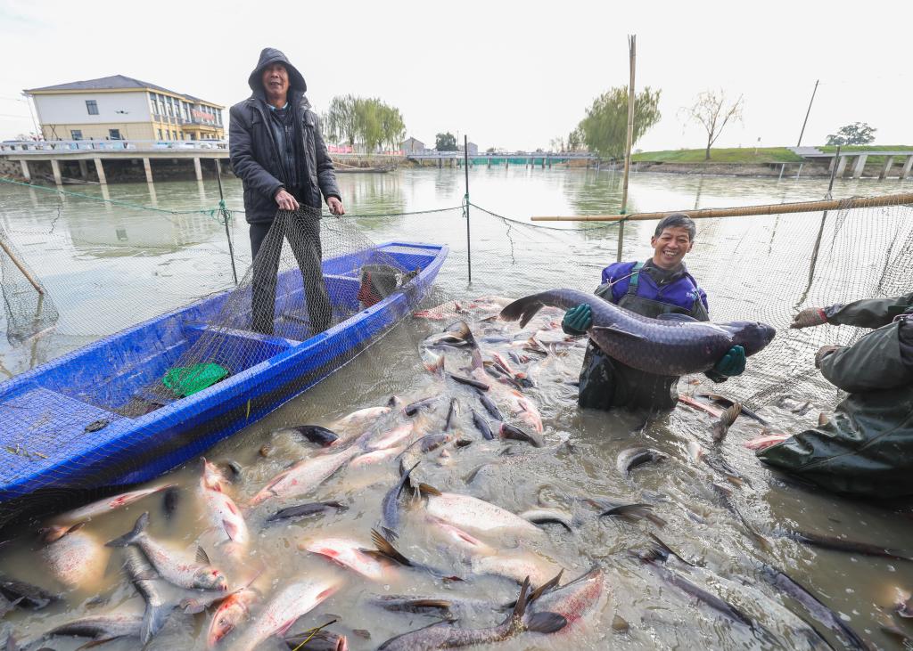↑ 2023年12月23日,浙江省湖州市吳興區東林鎮泉慶村村民在拉網捕魚,用于烹制當地的特色魚湯飯美食。當日,浙江省湖州市吳興區東林鎮的水鄉“魚湯飯 品豐年”迎新年活動在泉慶村舉辦,活動包括清塘捕魚、全魚宴、魚圓魚餅、手作方糕等年味美食的制作及品嘗,還有歌舞表演、魚王拍賣、非遺柳編現場展示、書法愛好者寫春聯送祝福等,以迎接新年的到來,展示當地特色民俗文化和美食,助力鄉村旅游發展。