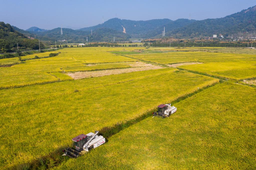 ↑ 2023年10月18日,在諸暨市蒼湖糧食專業合作社的水稻田里,收割機在收割水稻。
