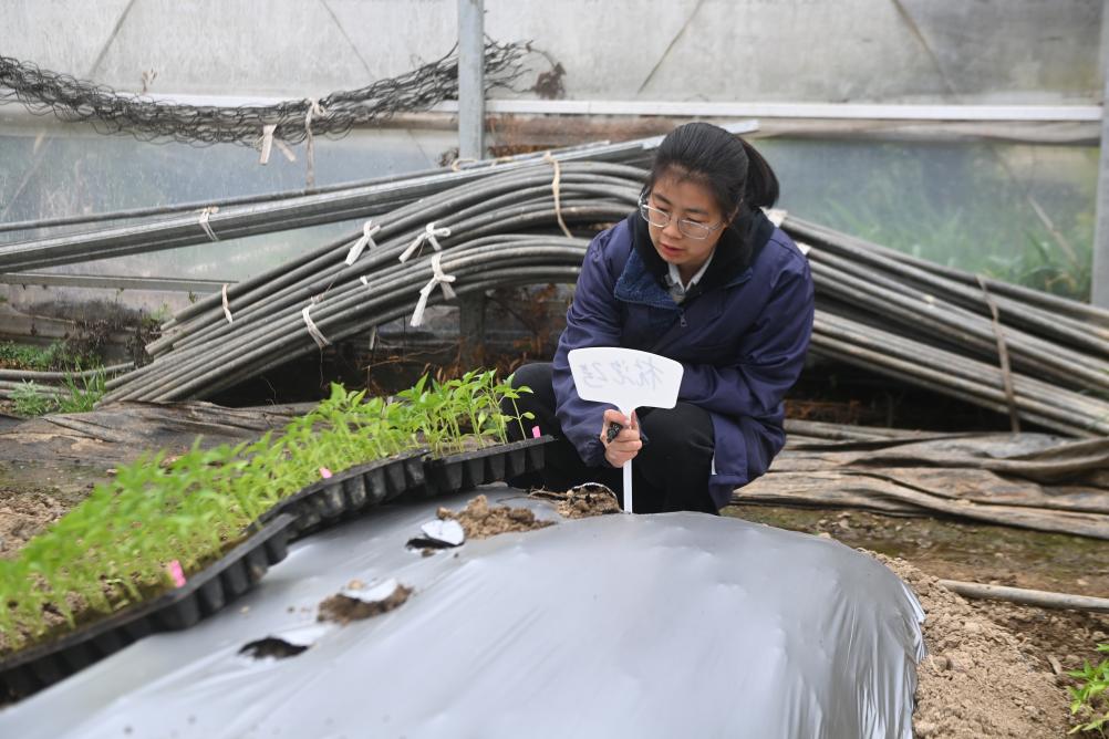 ↑ 2023年3月17日,在杭州市臨安區清涼峰鎮的九都村蔬菜基地內,新農人王瑜在給一批菜苗進行定植。王瑜是九都村回鄉創業的“新農人”,從事高山蔬菜育苗和種植,也是農村青年致富帶頭人。