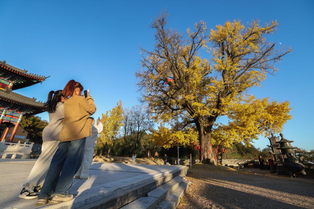 ↑ 2023年11月21日,游客在觀賞拍攝諸暨市店口鎮杭塢山頂的古銀杏樹。初冬時節,杭塢山頂三德寺門外有著500年和300年樹齡的兩株古銀杏金黃滿樹,成為當地山鄉美麗的風景。