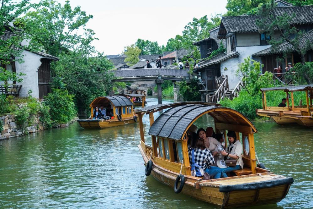 ↑ 2023年5月2日,游客在濮院時尚古鎮內乘船游覽。