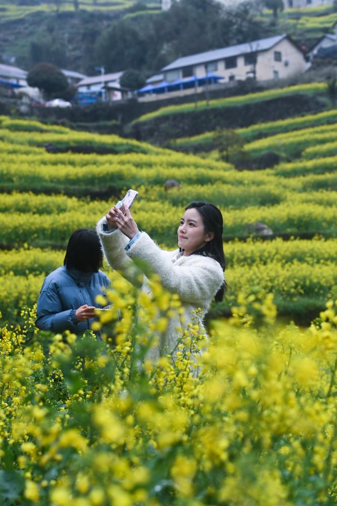 ↑ 2023年3月25日,游客在浙江省建德市乾潭鎮邵家村胥嶺自然村的油菜花梯田中拍照留影。浙江省建德市乾潭鎮海拔400多米的邵家村胥嶺自然村梯田油菜花紛紛盛開,當地舉辦以“花田有喜·同心共富”為主題的胥嶺花朝節,吸引了各地游客前來觀賞山村春季美景,共享春日美好時光。
