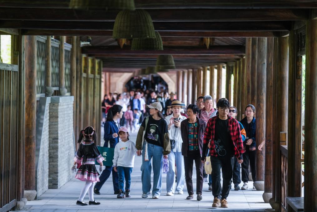 ↑ 2023年5月2日,游客進入濮院時尚古鎮內游覽?!拔逡弧奔倨谄陂g,位于浙江省嘉興桐鄉市濮院鎮的濮院時尚古鎮日接待游客近兩萬人次。