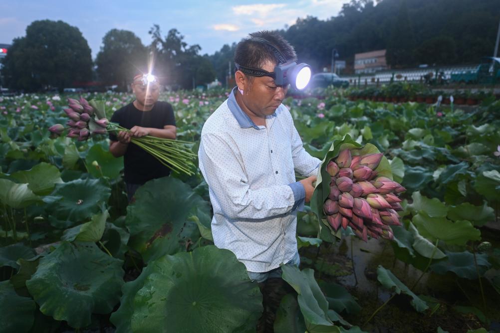 ↑ 2023年7月6日清晨,浙江省建德市大慈巖鎮里葉村村民在荷塘里摘荷花和蓮蓬。這些荷花、蓮蓬分類包裝后,將快速運往江浙滬的花卉市場。近期,浙江省建德市大慈巖鎮的數千畝荷花塘迎來盛花期,每天有上萬支荷花從這里發往周邊省市的花卉市場,成為當地百姓致富的重要途徑之一。建德是浙江省白蓮的主產區,目前大慈巖鎮的白蓮種植面積達到8000多畝。