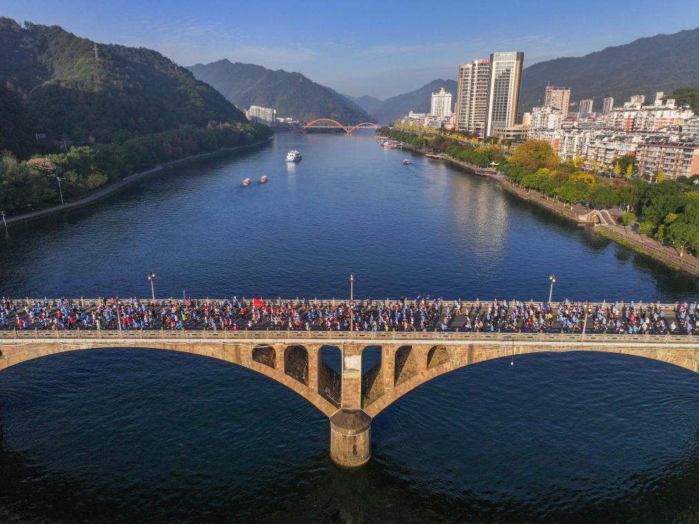 ↑ 2023年11月19日,參賽選手在比賽中經過白沙大橋。當日,浙江省建德市舉行建德17℃新安江馬拉松比賽。賽事設置全程馬拉松、半程馬拉松和歡樂跑項目,路線沿新安江途經多個建德景區和地標。