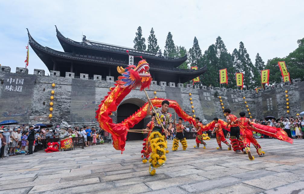 ↑ 2023年6月22日在浙江嘉興子城遺址公園廣場拍攝的舞龍表演。
