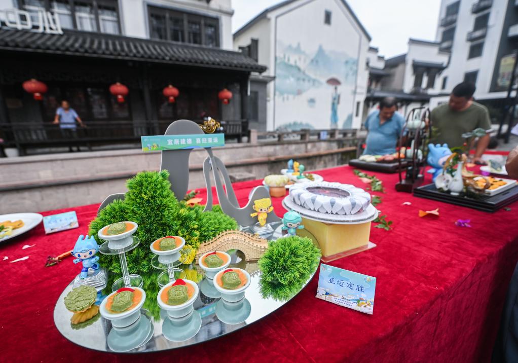 ↑ 2023年9月6日,在浙江省建德市壽昌古鎮開幕的古鎮好吃節上,由建德市餐飲協會制作的“魚躍亞運”“騰龍飛天”“亞運定勝”“金牌滿堂”等多道亞運主題菜品在現場展示,吸引了眾多市民的眼球。
