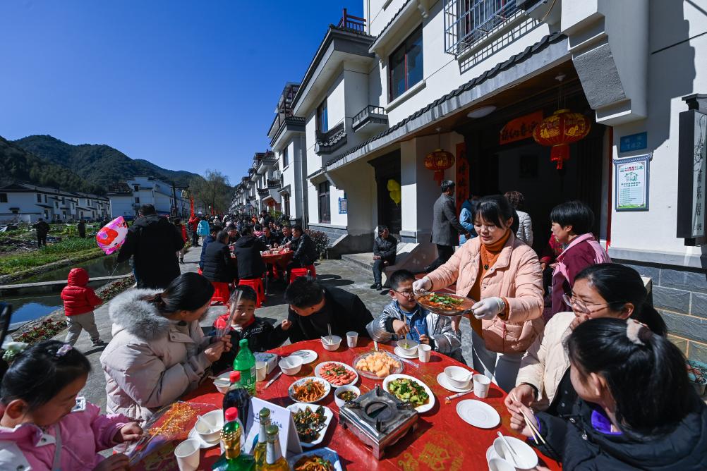 ↑ 2023年2月26日,游客們在蓮花鎮戴家新村的百家宴上品嘗特色美食。