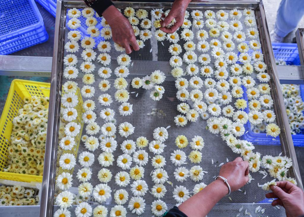 ↑ 2023年11月4日,在三村村一家現代農業企業內,村民分揀剛剛采摘的杭白菊。