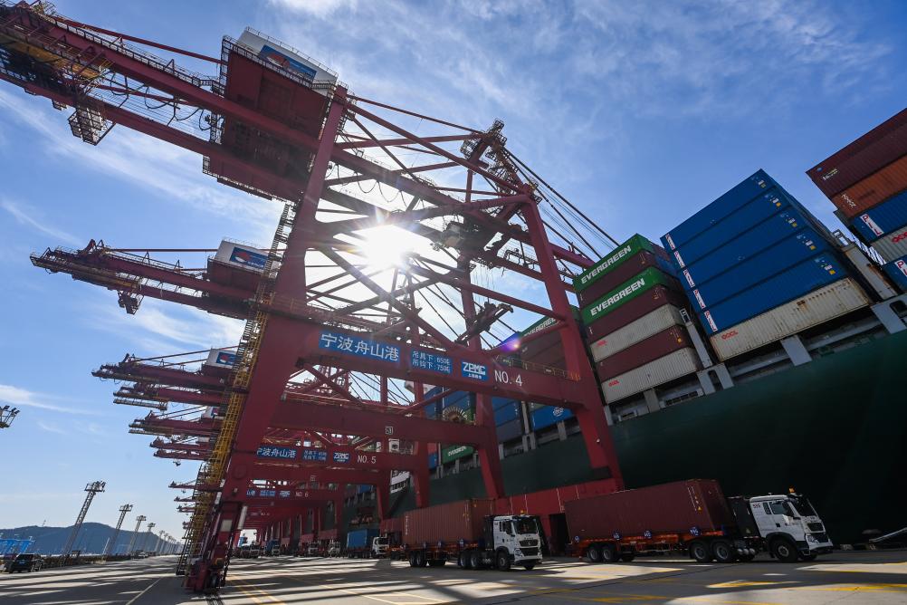 ↑ 2023年1月31日,在寧波舟山港金塘港區大浦口集裝箱碼頭上,一艘外籍貨輪在靠泊卸貨。