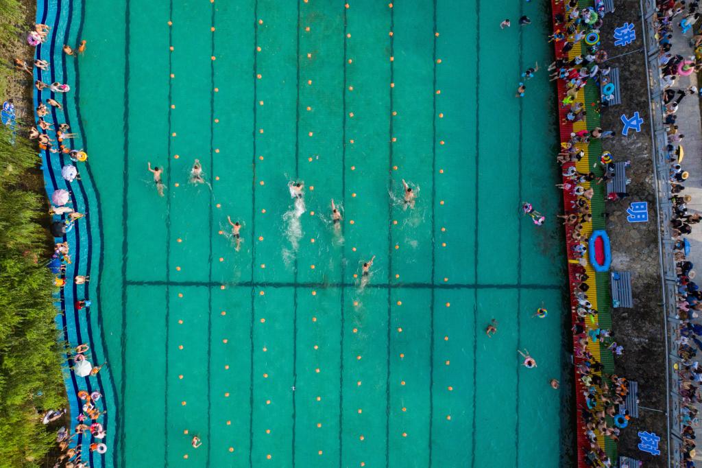 ↑ 2023年7月14日,村民在乾潭鎮下包村胥溪天然泳場參加趣味比賽。