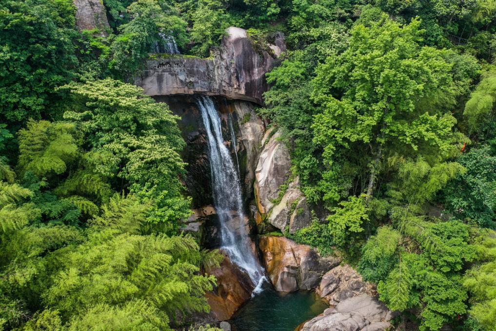 ↑ 2023年5月16日在浙江省臺州市天臺縣天臺山風景旅游區拍攝的石梁飛瀑一景。石梁飛瀑景點有一條巨大石梁橫跨在兩崖之間,瀑布水流從梁底穿過,墜入幽谷之中。徐霞客在游記中寫道:“下瞰深潭,毛骨俱悚?!?/span>