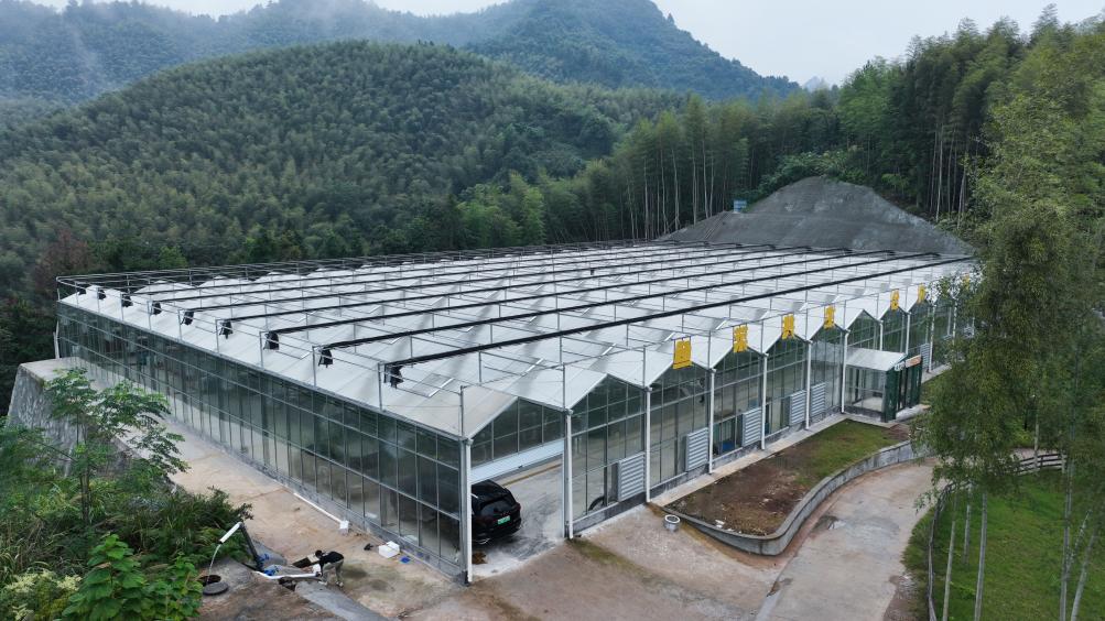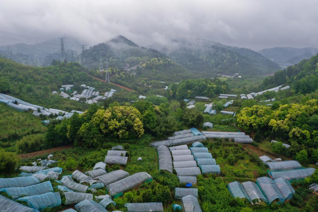 ↑ 2023年4月23日,細雨中的杭州市臨安區錦南街道上甘村櫻桃谷拍攝的櫻桃大棚。