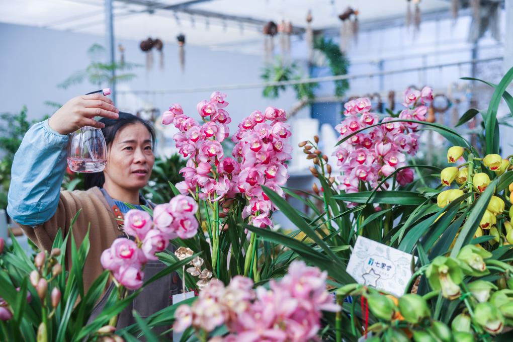 ↑ 2024年1月4日,澧浦鎮花卉苗木城內一家商戶的工作人員給大花蕙蘭噴水。元旦過后,浙江省金華市金東區澧浦鎮花卉苗木城內,600余家花卉苗木商戶開始展銷不同品種的年宵花,1000多個品種的年宵花卉供市民、游客挑選。