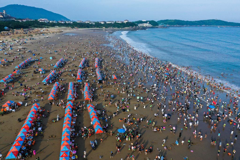 ↑ 2023年7月8日拍攝的朱家尖南沙景區。7月初開始,地處東海之濱的浙江省舟山市朱家尖南沙景區、東沙景區迎來了暑期旅游旺季,景區日均游客量在2萬人次左右。