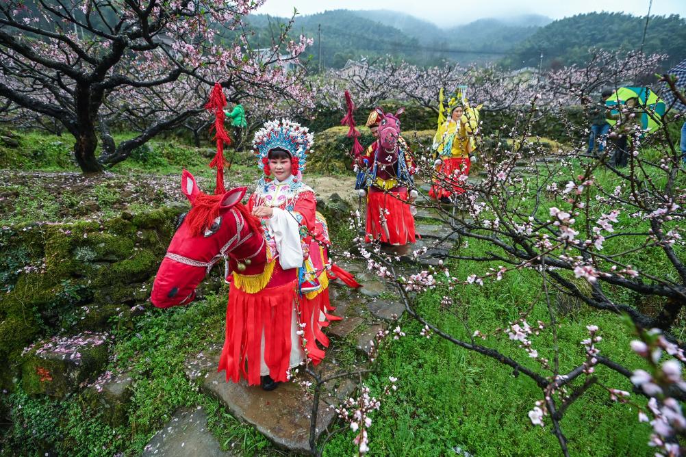↑ 2023年3月25日拍攝的在半山村的桃園內進行的傳統竹馬表演。浙江省杭州市富陽區新登鎮首屆山花大會暨第二十屆半山桃花節在半山村啟幕,半山村迎來了一年中最美、也是最熱鬧的時節,千余畝競相開放的桃花和現場的民俗表演吸引游客前來觀賞。