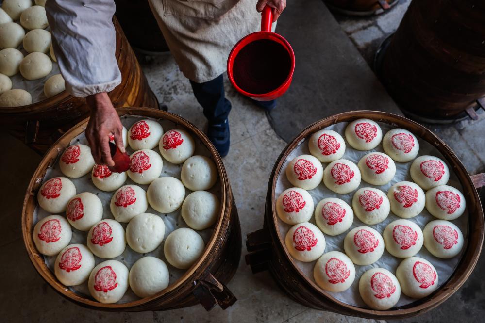 ↑ 2024年1月3日,在金華市金東區赤松鎮二仙橋村,65歲的姚國憲在給蒸好的饅頭蓋上傳統紅印。金華紅印饅頭以酒釀發酵制作,是當地逢年過節、操辦喜事宴席的傳統美食。圓圓的饅頭有“團團圓圓、蒸蒸日上”的寓意,寄托著美好的期待和祝愿。如今傳統饅頭產業已經成為當地百姓的富民產業。