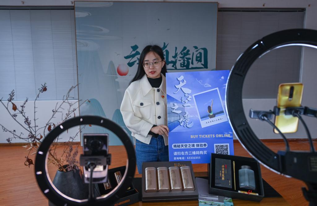 ↑ 2023年3月23日,博士研究生畢業的里山鎮安頂村村書記助理楊悅正在黨員直播間內進行安頂村“天空之境”旅游業態的直播推廣。近年來,浙江省杭州市富陽區里山鎮致力于鄉村人才“回流引流”,著力“回引”新鄉賢、青創客等創新經營人才,盤活鄉村資源,豐富產業新業態,拓寬了農文旅融合發展路子,相繼打造了“天空之境”“云霧茶吧”“家在富春山居·安頂云霧共富集市”等美麗山鄉文旅新業態,推動了村集體和村民增收,助力鄉村振興和共同富裕。