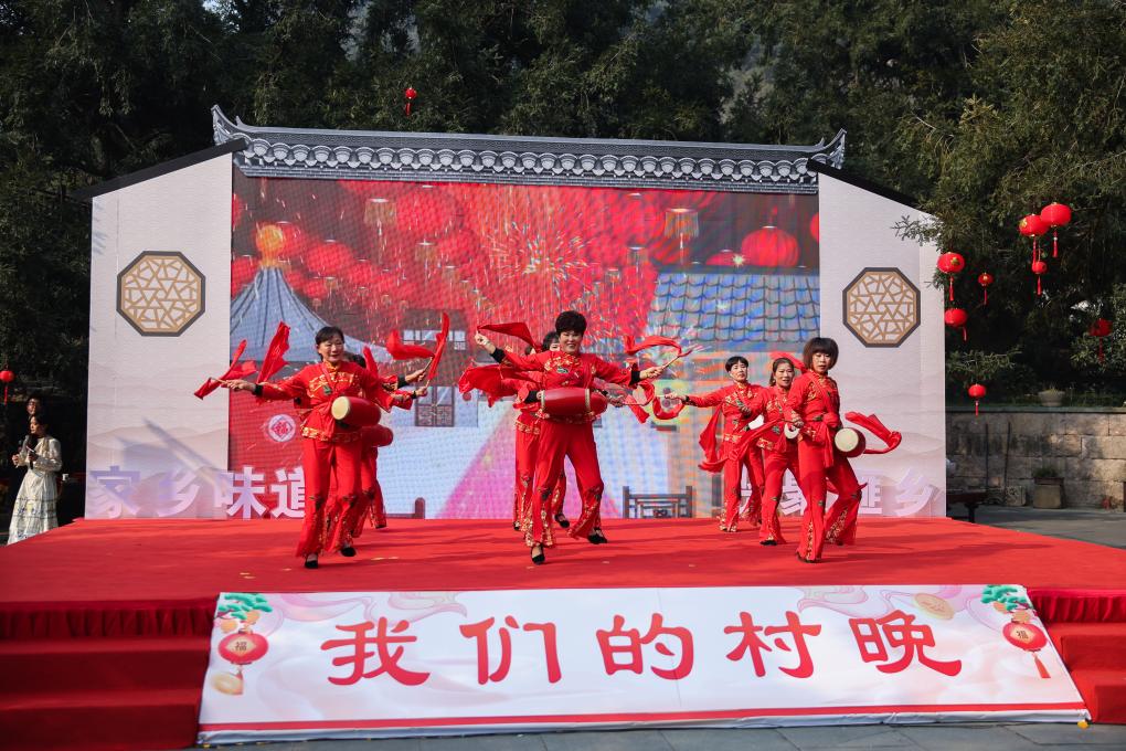 ↑ 2023年12月28日,諸暨市趙家鎮村民在村晚舞臺上表演腰鼓。當日,在浙江省諸暨市趙家鎮香榧國家森林公園的香榧文化會館舉行了一臺“家鄉村晚”。這臺家鄉村晚由當地百姓共同參與演出,特色產業、文旅景點等多重元素融合帶來了濃濃年味,讓百姓在歡樂喜慶的氣氛中迎接新年的到來。