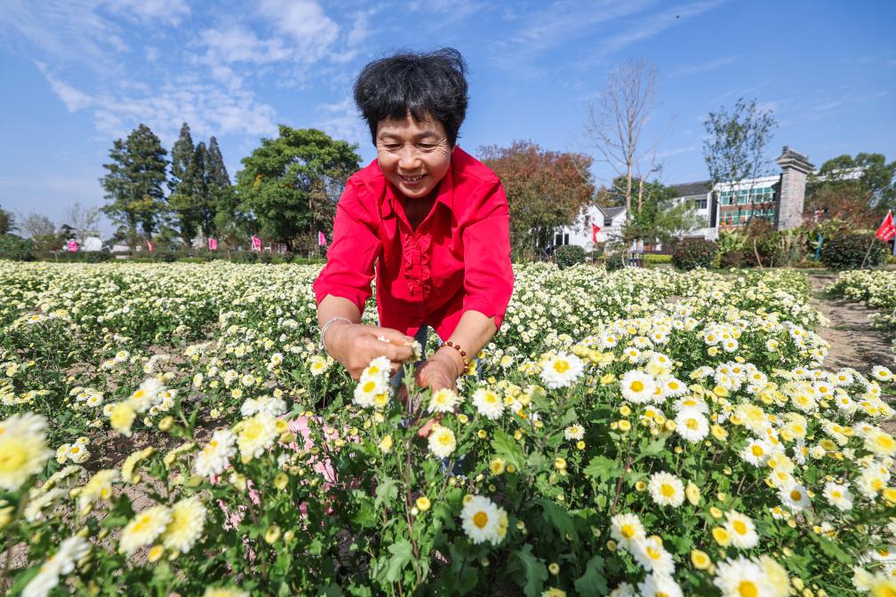 ↑ 2023年11月4日,村民許巧芬在杭白菊基地里采摘杭白菊。桐鄉是杭白菊原產地,被譽為“中國杭白菊之鄉”。