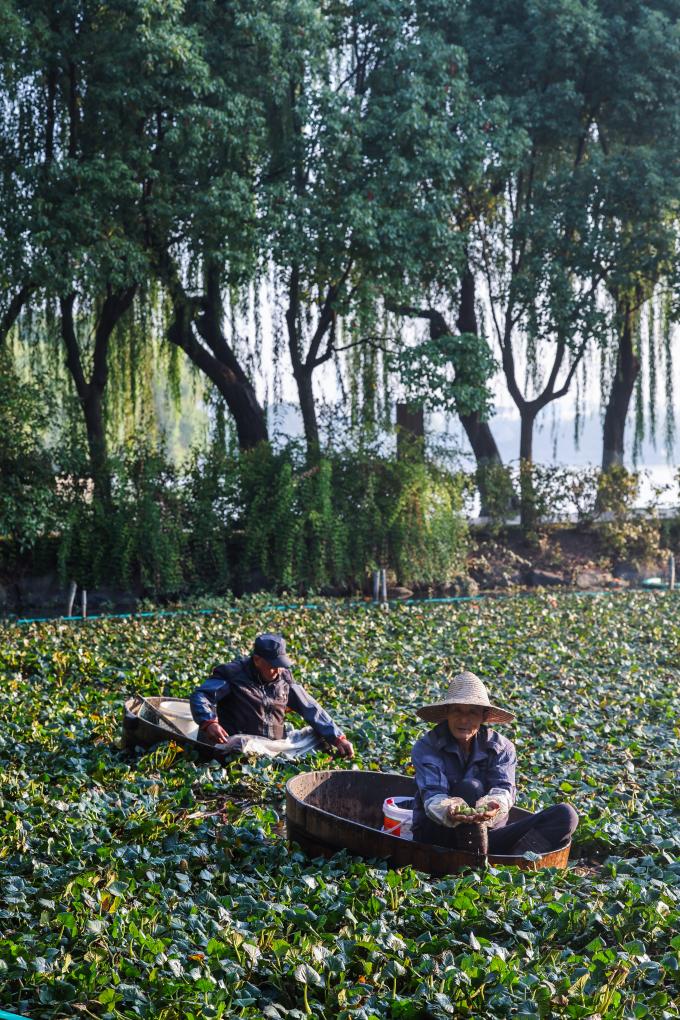 ↑ 2023年10月12日清晨,種植戶劃著菱桶采摘成熟的南湖菱。
