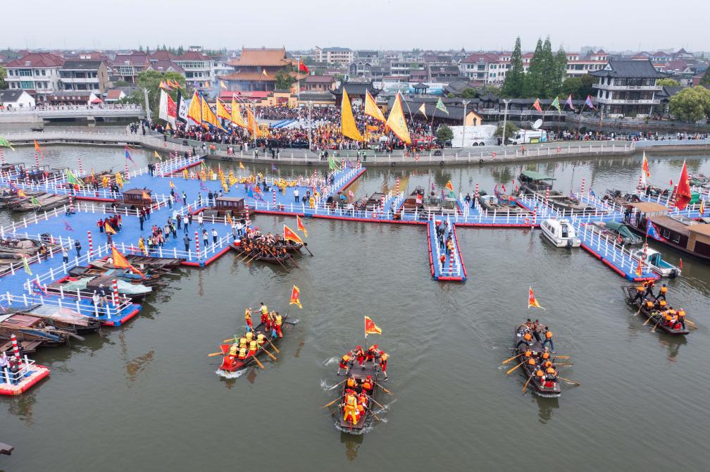 ↑ 2023年4月18日,傳統踏白船表演在王江涇鎮蓮泗蕩的網船會現場舉行,江浙滬一帶漁民、船民紛紛駕船前來趕廟會,呈現一場“水上民俗盛宴”。