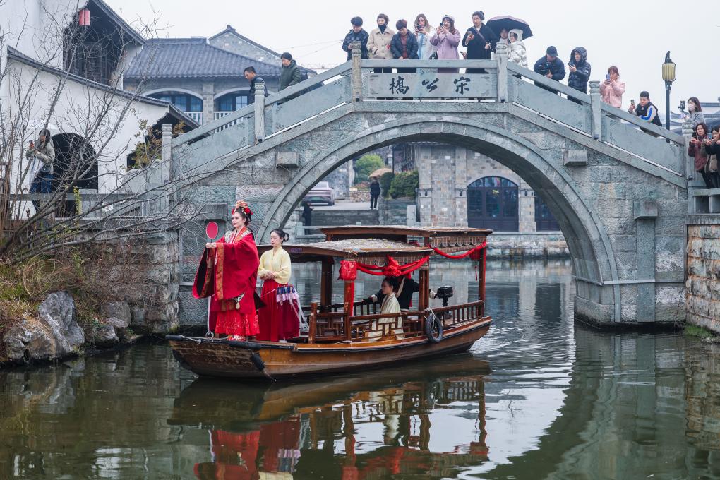 ↑ 2024年1月18日,中外青年身著傳統服飾在建德嚴州古城的船上體驗傳統水上婚禮習俗,包括出閣、梳妝、登船、親迎、禮拜等多個環節。